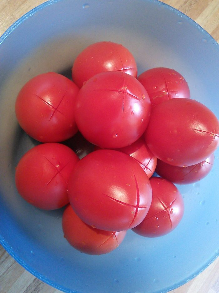 Помидоры надрезать накрест, залить кипятком, подержать 1 минуту в кипятке, слить, обдать помидоры ледяной водой, снять кожицу, нарезать на мелкие кубики.