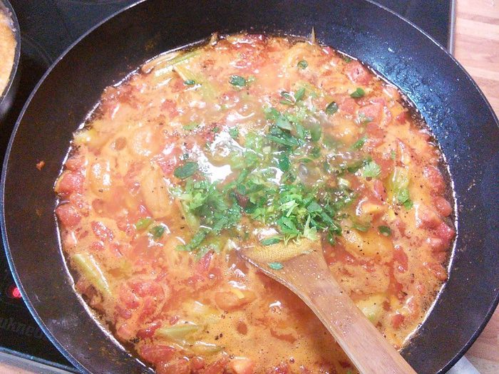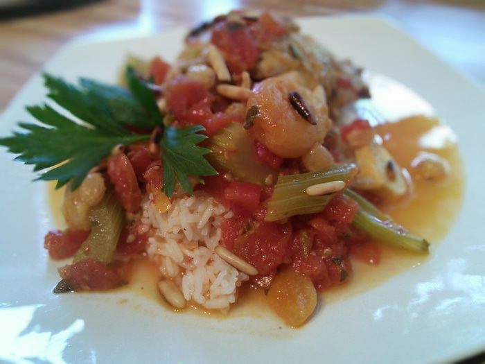 В эту же сковороду влить бульон, помидоры, апельсиновый сок и цедру, курагу, изюм и сельдерей. Соус довести до кипения, убавить огонь до среднего и 10 мин. потомить с открытой крышкой. Я добавила от себя зубок чеснока.