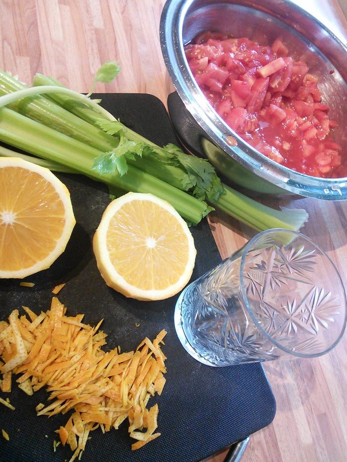 Снять цедру с апельсина, мелко её порезать. Сок апельсина выдавить. Сельдерей нарезать крупными брусками.