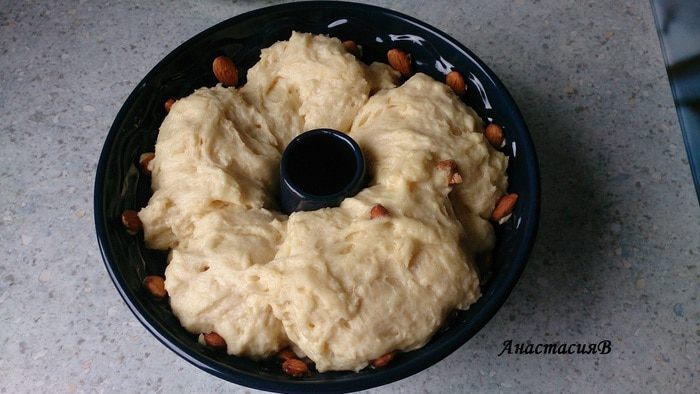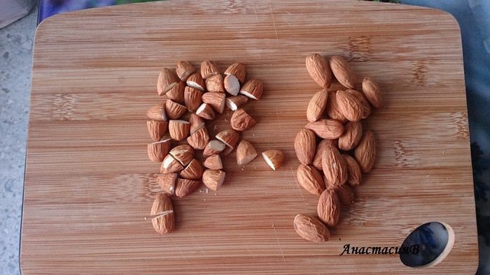 50 г миндаля разрезать пополам и добавить к тесту.