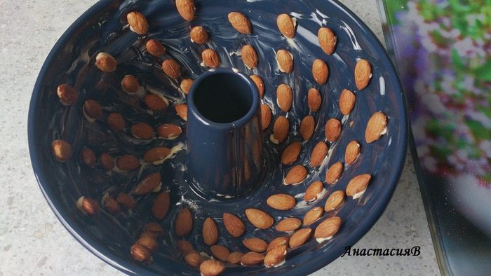 Смазать форму для кекса (24см) маслом и выложить аккуратно оставшийся миндаль.