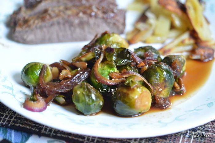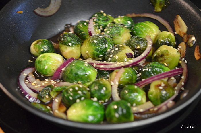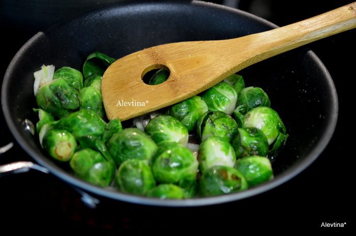 На сковороде-вок или большой сковороде обжарить на масле брюссельскую капусту с имбирем - 3 см, нашинкованным тонко, с долькой чеснока тонко порезанной, постоянно помешивая 5-6 мин.с добавлением воды 2-4 ст.л.