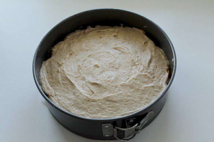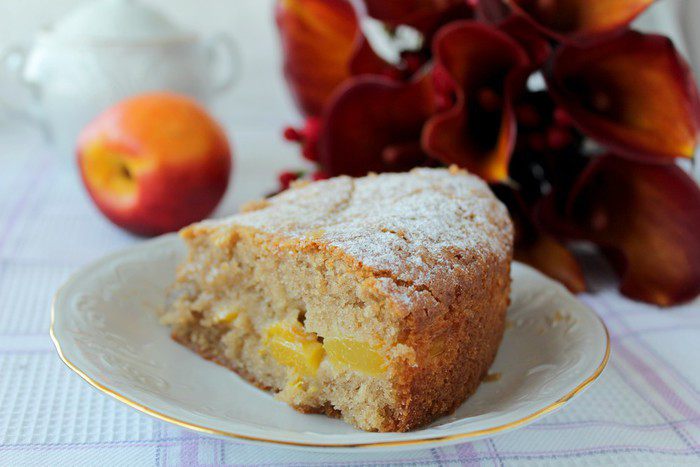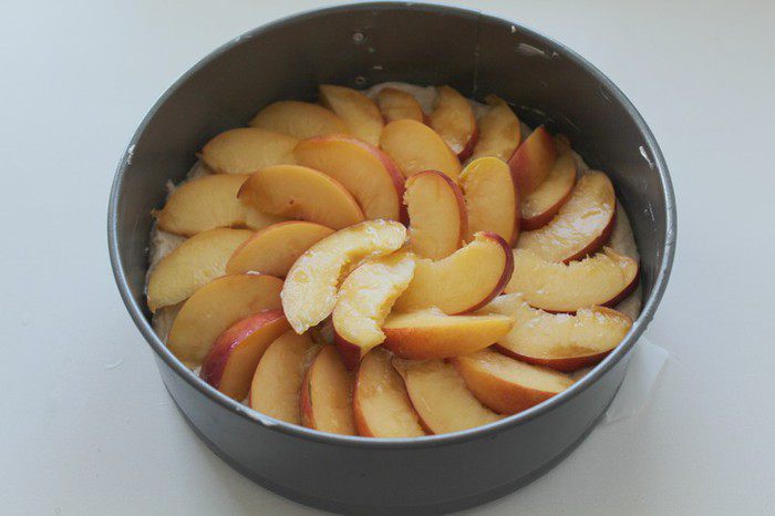 Форму 20-22 см смазать сливочным маслом, посыпать мукой и выложить половину теста. Нектарины порезать и выложить поверх теста.