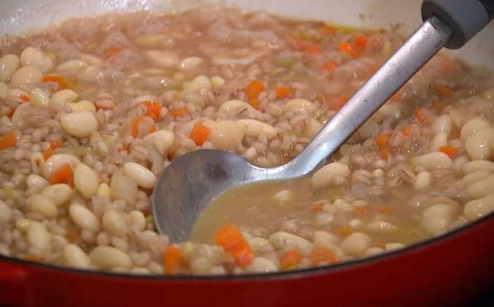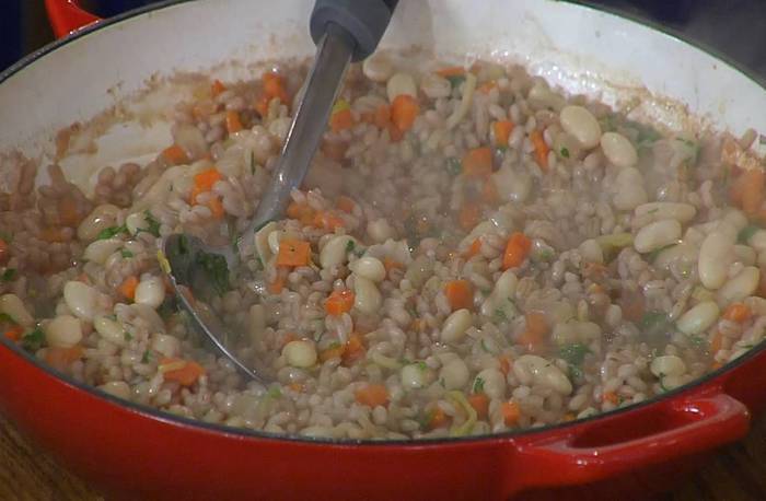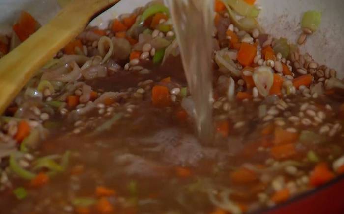 Добавить вино, увеличить огонь и дать алкоголю выпарится, затем влить горячий бульон, так чтобы перловка была покрыта, и готовить на маленьком огне, подливая по необходимости бульон.