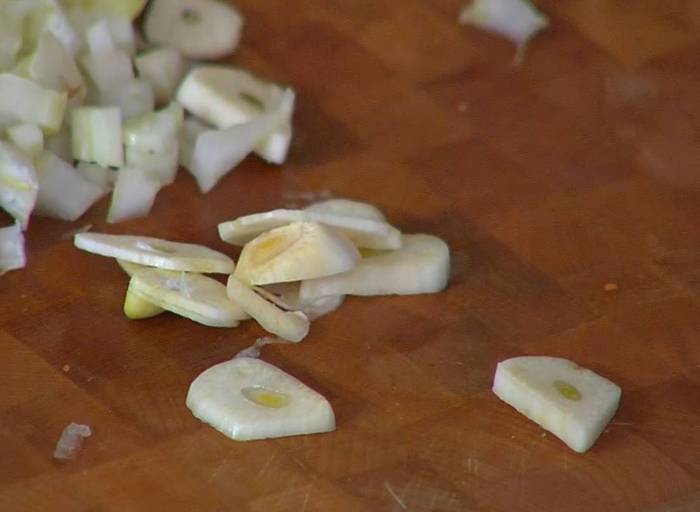 Весь чеснок почистить, один зубчик нарезать пластинками, один зубчик мелко порубить.