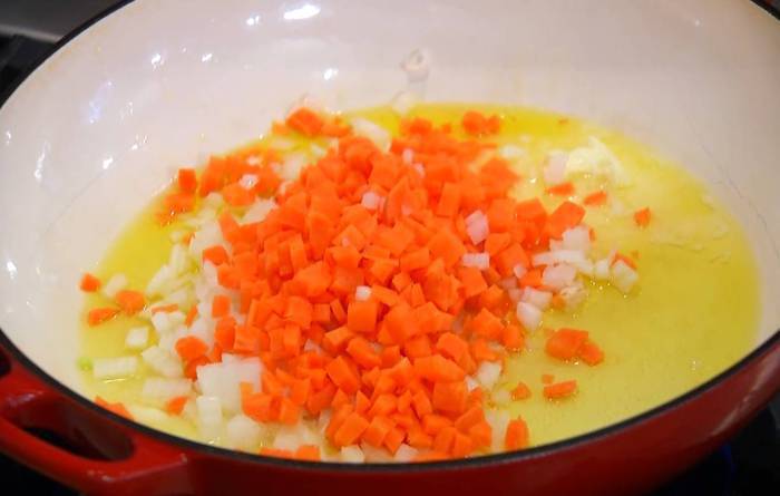 Разогреть в глубокой, тяжелой сковороде или сотейнике полторы ст. ложки оливкового масла и сливочное масло, обжарить морковь и нарезанный лук.