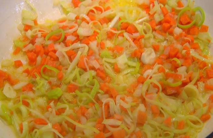 Сельдерей и лук-порей тонко нарезать и выложить к луку в сковороду с морковью, добавить нарезанный пластинками чеснок, все перемешать и томить 5‒7 минут на маленьком огне, пока овощи не станут мягким.
