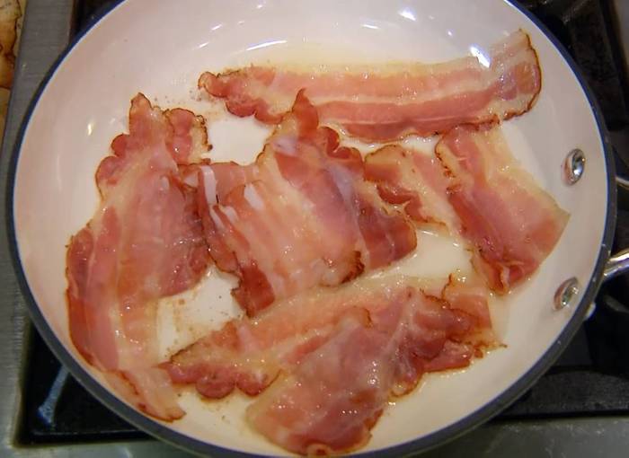 Разогреть в сковороде оставшееся оливковое масло и обжаривать полоски бекона до появления золотистой корочки.