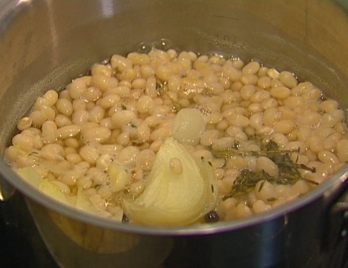 Фасоль залить водой согласно инструкции на упаковке, добавить целиком помидор, луковицу, зубчик чеснока и лавровый лист, варить до готовности без добавления соли, затем овощи и лавровый лист удалить.