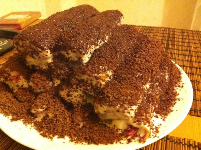 Каждую испеченную трубочку смазать кремом и уложить слоями как "полено"