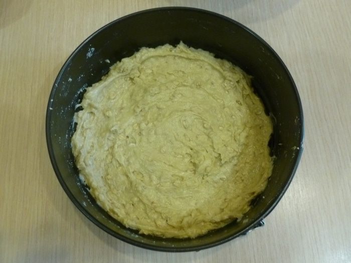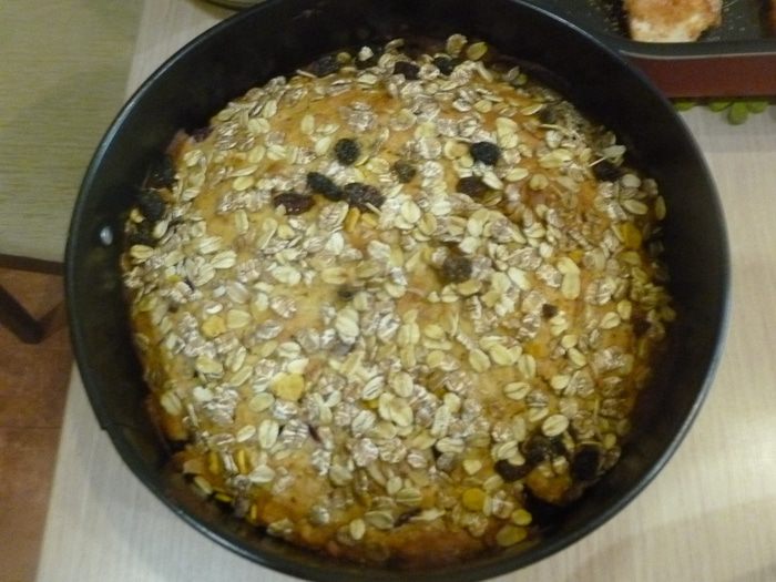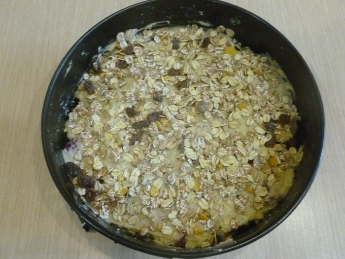 Посыпать мюсли. Поставить в духовку на 20 минут. Убавить температуру до 170°С. Выпекать еще 40 минут. Готовность проверить зубочисткой.