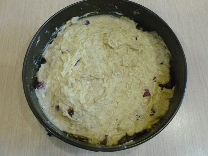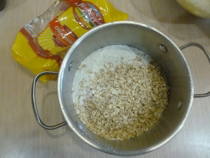 Просеять муку с разрыхлителем, смешать с овсяными хлопьями. Соединить с яичной смесью.