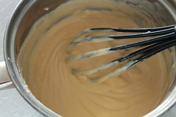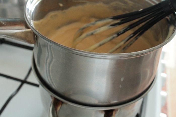 Затем приготовить водяную баню: в кастрюльку налить такое количество воды, чтобы она не касалась дна посуды, в которой будем варить пудинговую смесь. Дать воде закипеть, уменьшить огонь до среднего. Ставим посуду со смесью и нагреваем, непрерывно помешивая венчиком. Как только смесь начинает густеть, сразу же снимаем посуду с водяной бани.