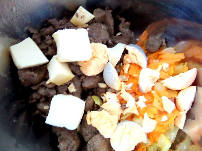 Для запекания обычно добавляют яйца сырые или желтки, но я не запекала потом и добавила варёные желтки.
