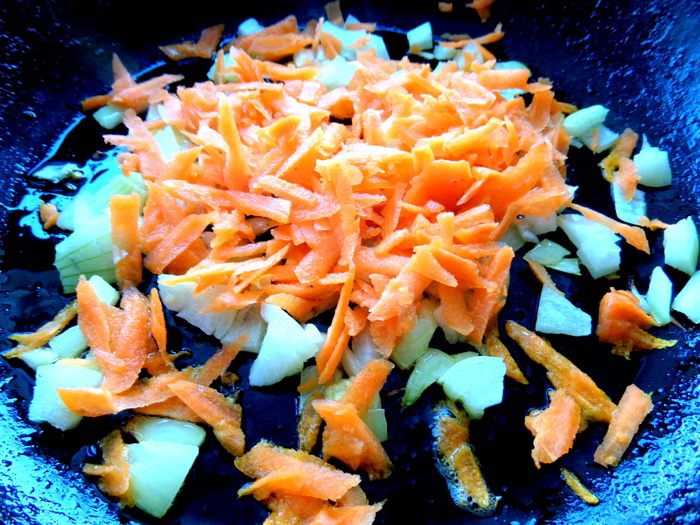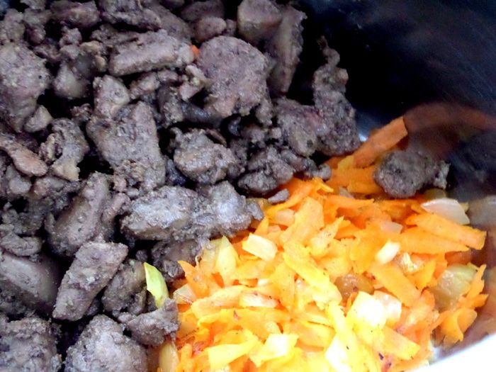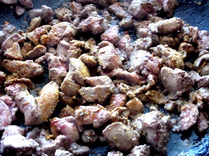 Уберём со сковороды и там же пропассеруем печёнку постоявшую в уксусе. Я добавила сухих овощных приправ с солью. Доводим до готовности со всех сторон.