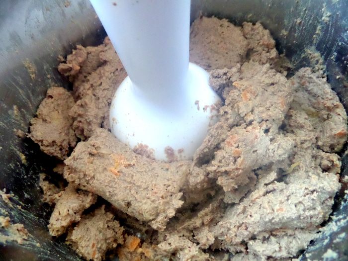 Взбиваем всё блендером. Если суховатая печень, можно добавлять по ложечке бульон или молоко или сметанку.