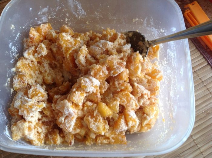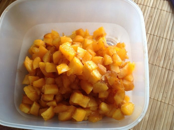 Абрикосы положить в кипяток на 30 секунд, чтобы легче было снять кожицу. Кожу снять, косточки удалить, а мякоть разрезать на мелкие кубики.