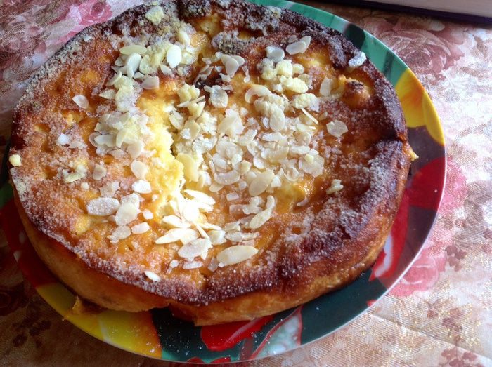 Готовую запеканку посыпать сахарной пудрой, цедрой лимона и миндальными пластинками.