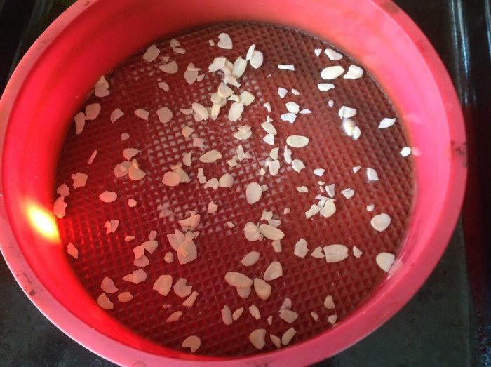 Круглую форму смазать маслом и посыпать миндальными пластинками