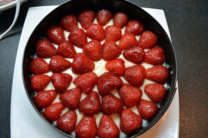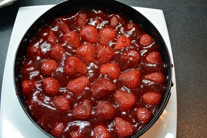 Горячую заливку сразу же выливаем на все "пробелы" между клубничками.