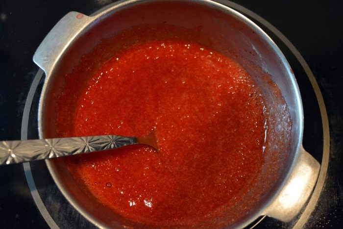 Для этого, оставшуюся клубнику пюрируем погружным блендером, добавляем сахар и ставим на огонь.