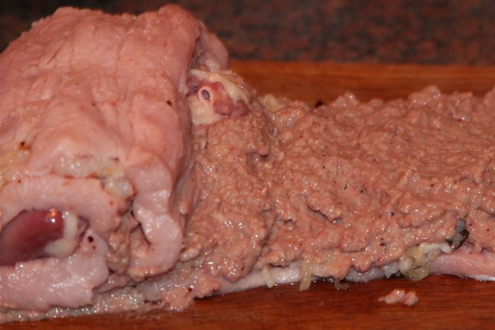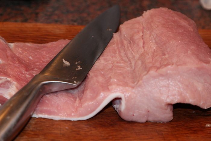 Свиную вырезку вдоль волокон подрезаем и раскрываем таким образом, чтобы получилась лента.