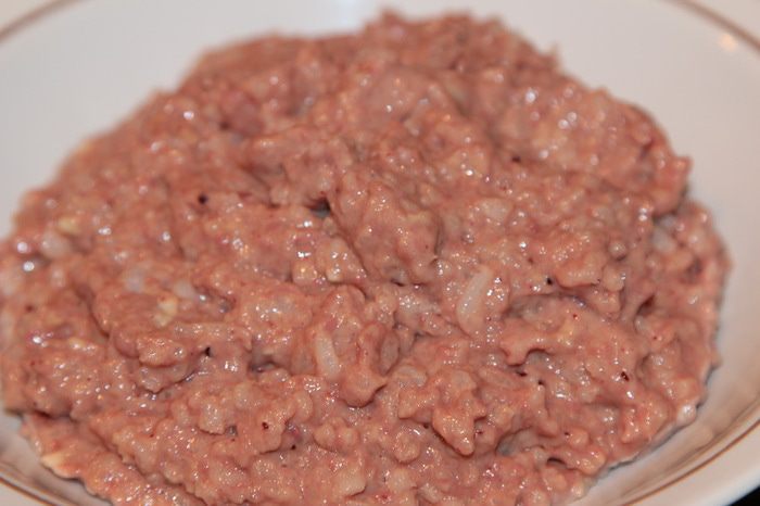 Отвариваем рис до полуготовности, печень нарезаем, добавляем чеснок и пробиваем все блендером.
