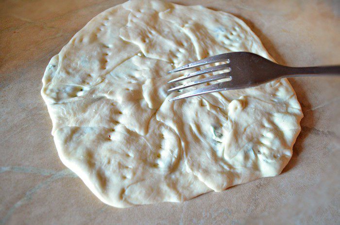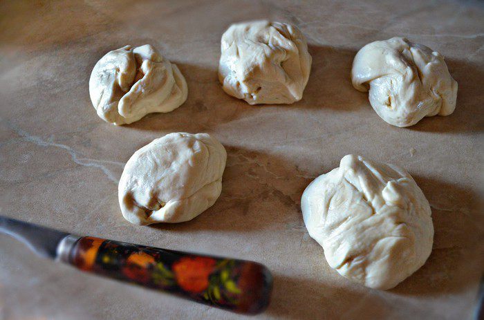 Просеять муку в миску. В тёплой воде растворить соль. Добавляя воду к муке, хорошо перемешать и вымесить тесто (количество муки может быть немного больше или меньше) На руку наливая растительное масло, продолжаем вымешивать тесто. Разделяем тесто на 5-6 кусочков. Получается очень нежное эластичное тесто.
