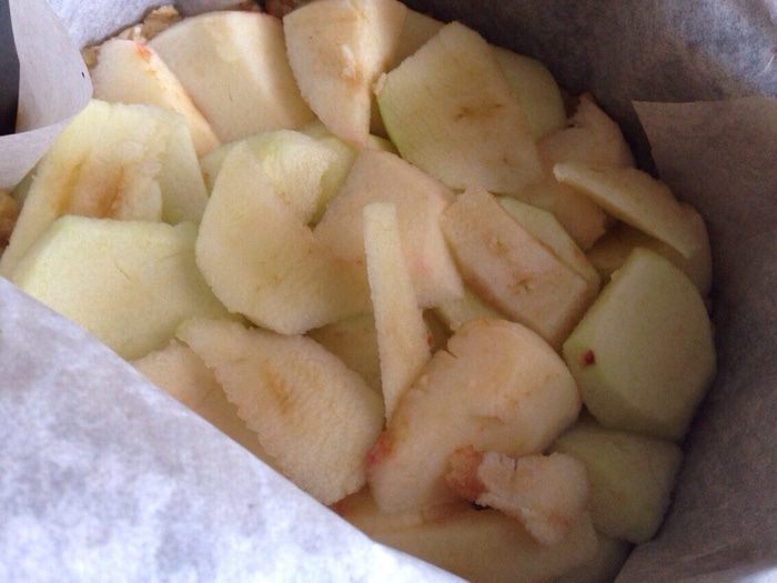 Тем временем яблоки очистить и нарезать тонкими дольками.Вынуть форму и распределить яблоки по поверхности теста.
