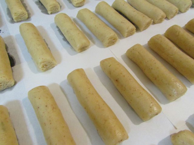 Каждую часть раскатать на столе в длинный жгут и нарезать бруски, длина примерно 7-8 сантиметров.