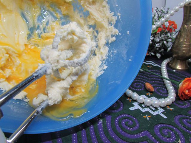 Добавить измельченный миндаль и разрыхлитель, хорошо перемешать.