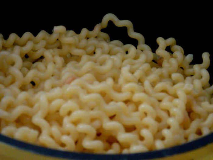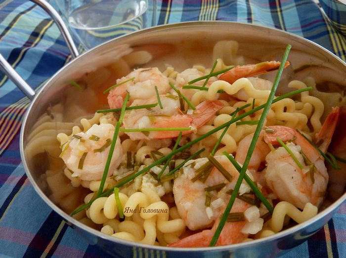 Перемешать пасту и креветки , посыпать луком .