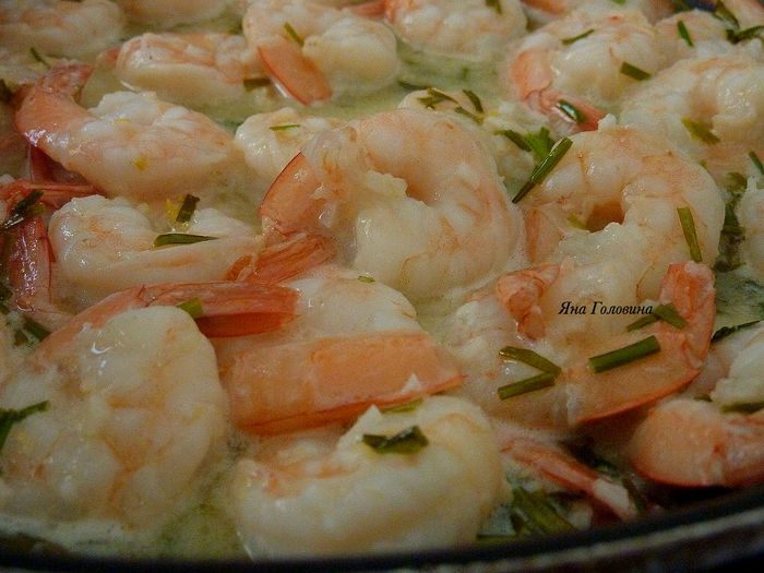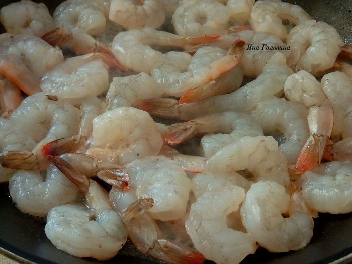Пока варится паста , разогреть масло оливковое в большой сковороде . Обжарить креветки 3 минуты .