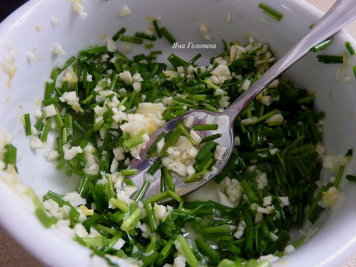 Измельчить чеснок и лук .