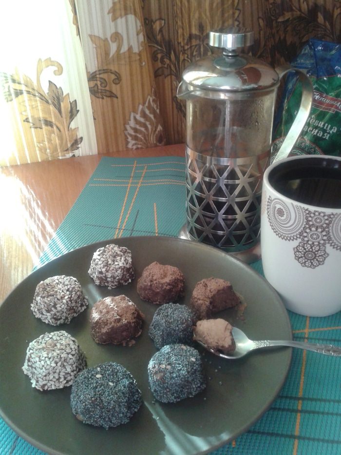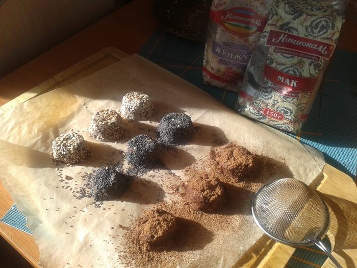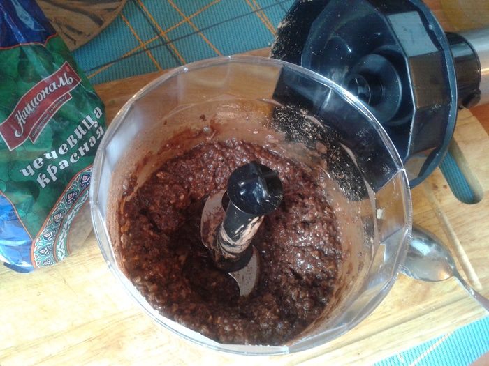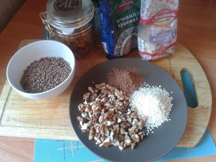 В чашу блендера высыпать подготовленные сухие ингредиенты, часть кунжута и какао оставить на посыпку. Добавить сваренную чечевицу. Хотя в составе уже есть изюм, получается почти не сладко. Берегущим свою фигуру девушкам наверняка понравится. Но мои домочадцы любят сладкие пирожные, поэтому я добавила ложку меда. Смешать все блендером. Получится вязкая масса.