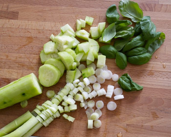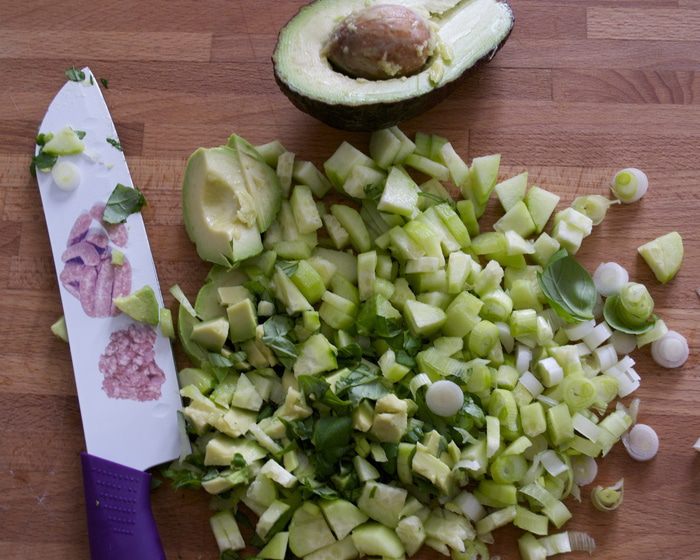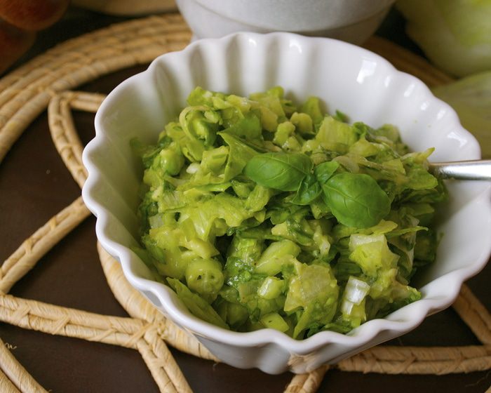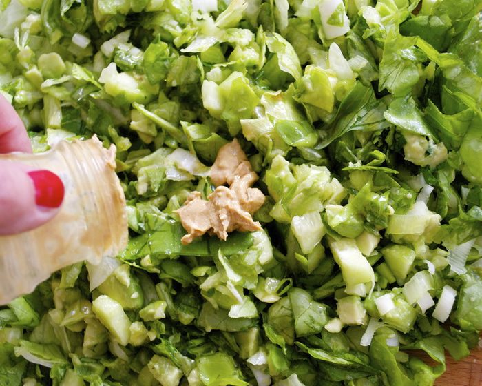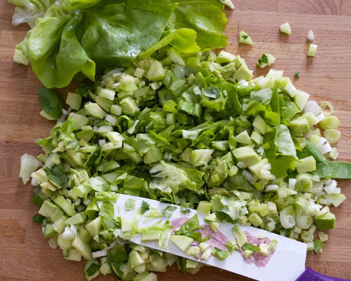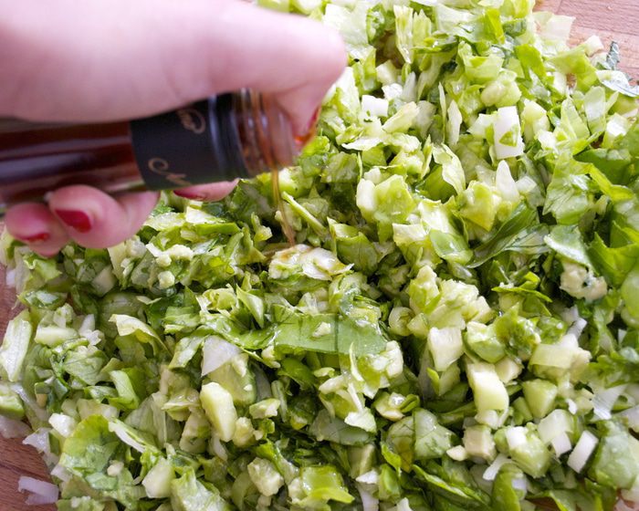 Далее, заправляем салат соусом. Можно просто уже нарезанный салат переложить в миску-салатник, смешать все ингредиенты для соуса и заправить им салат... Но, по рецепту мы также добавляем все ингредиенты для заправки прямо в овощную смесь, все перемешиваем на доске руками и уже после перекладываем салат в миску. Итак, собрать салат горкой на разделочной доске, полить оливковым маслом, добавить красный винный уксус...