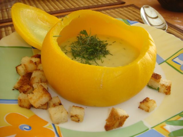 Очистить картофель, помидор ошпарить и снять кожицу все порезать и отварить вместе с кабачком 15 минут, вода должна только чуть прикрывать овощи (в итоге бульон нам понадобится примерно 1.5 ст.), пюрировать блендером, положить 2 ст.л. плавленого сыра, зелень порезанную, соль по вкусу и перемешать.