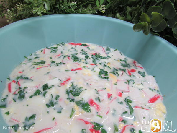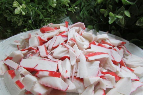 Крабовые палочки порезать крупными пластинками.