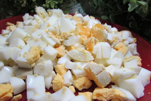 Яйца отварить, почистить и порезать крупными кусочками.