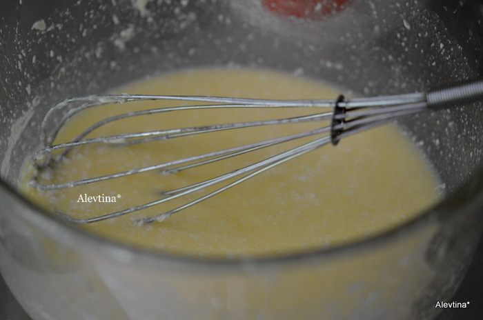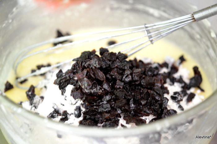 Затем муку и сушеные, порезаные сливы, перемешаем.