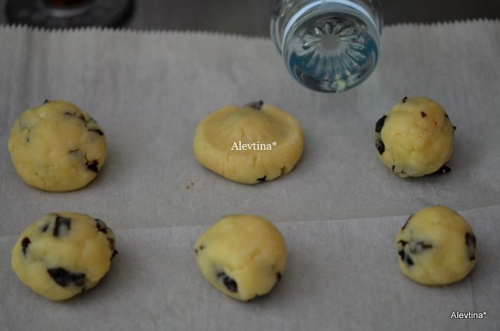 На противень выкладываем большой ложкой для мороженого тесто на расстоянии друг от друга и формируем в шарик. Используем рюмочку или с рифленым дном стакан. Прижимаем к шарику, чтоб донышко рюмки отпечаталось на тесте. И так с каждым шариком. Я использую штамп для печенья.