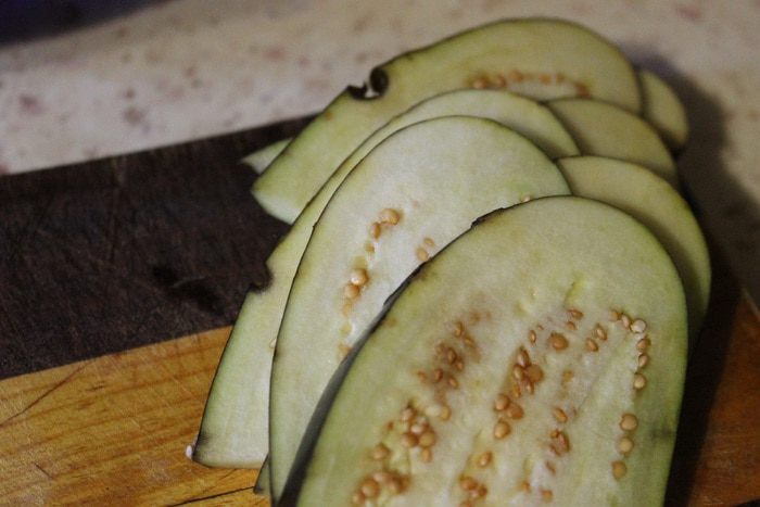 Баклажаны нарезать тонкими пластинками.