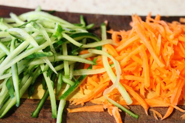 Морковь натереть на терке для корейской моркови, с огурцом поступить также, (старайтесь срезать только кожуру.)