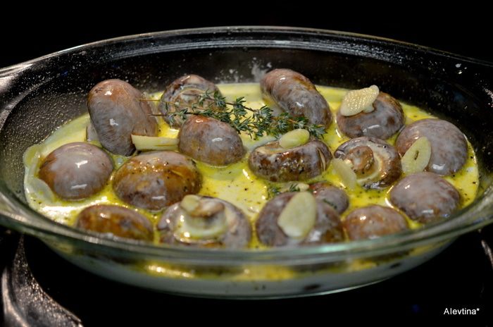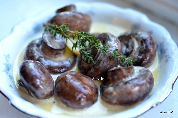 Поставим на огонь сливки, порезаный мелко чеснок и тимьян и готовим примерно 5 мин.не доводим до кипения. Выльем поверх грибов.