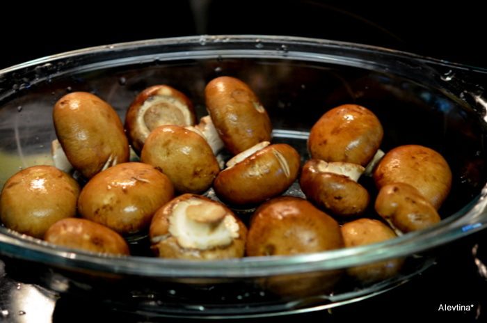 Разогреть духовку до 180 гр. Форму жаропрочную смазать сливочным маслом маслом 1 ст.л. Выложить помытые грибочки. Посолить и поперчить. Сбрызнуть оливковым маслом. Сверху выложить маленькие кусочки масла 1 стол.л.