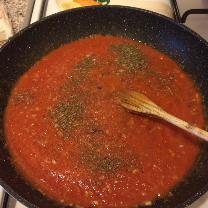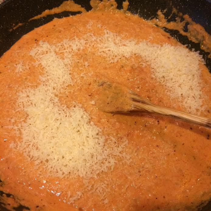 Томатный соус снять с огня, добавить сливки, быстро перемешать, затем добавить сыр.