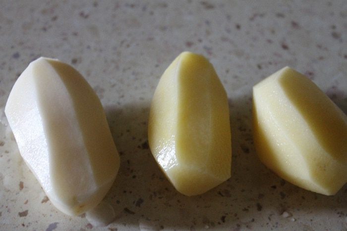 Нарезаем их на толстые кусочки, и кладем в бульон, к шейке. Варим до готовности картофеля.