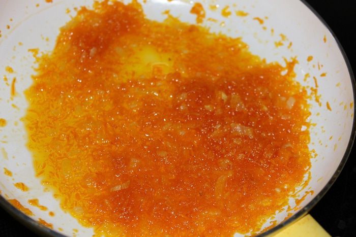 Лук нарезать мелкими кубиками, морковь потереть на мелкой терке, выложить в сковороду и добавить масло.