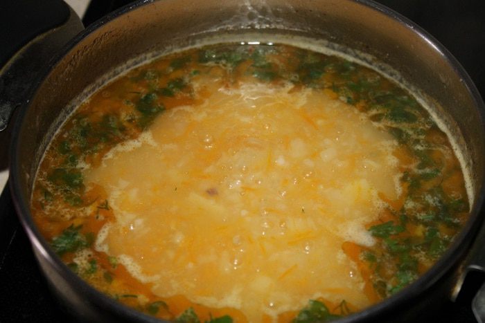 Далее добавляем рубленную зелень и выключаем огонь. Даем настояться супу 10 минут.