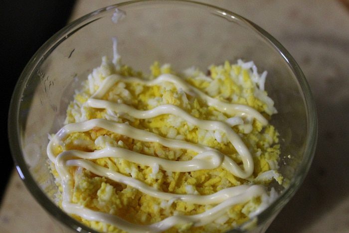 Яйцо сварить в крутую и натереть на мелкой терке. На дно бокала кладем половину яйца, сверху тонкая сетка майонеза.